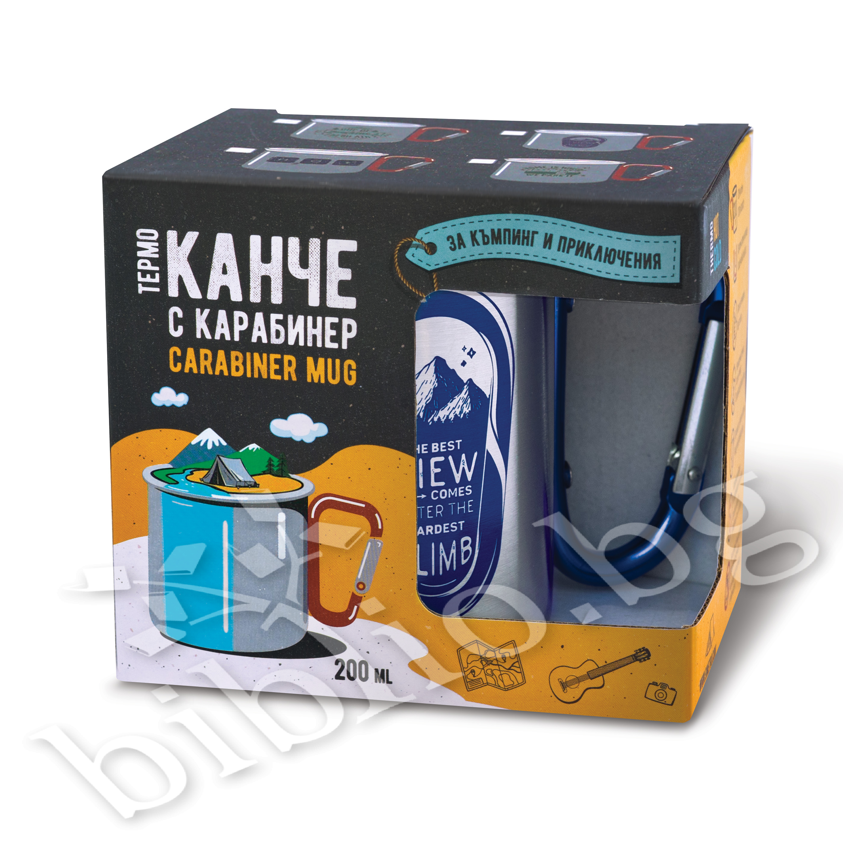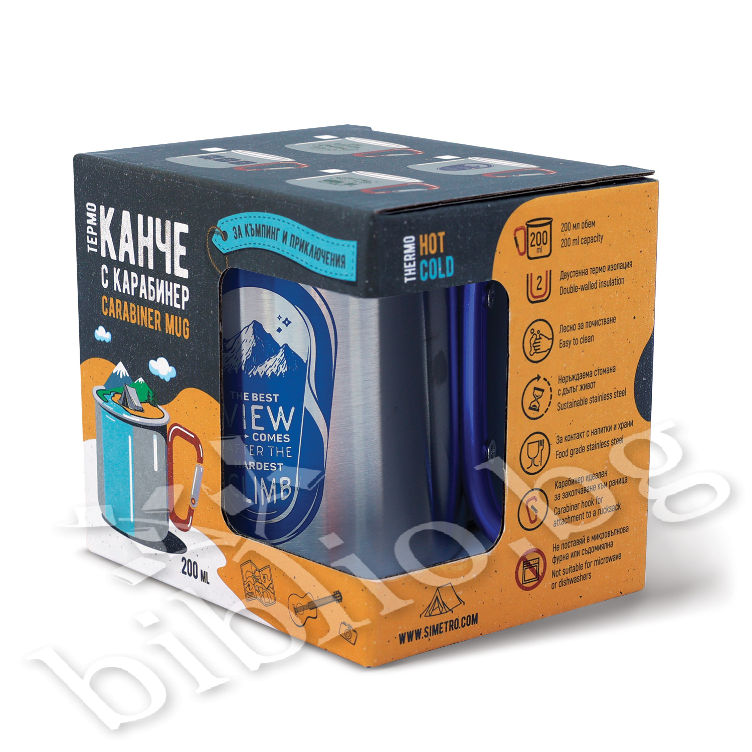 Вместо стандартна дръжка, канчетата са оборудвани с удобен карабинер, който позволява лесно закачане за раница, колан или екипировка. Така чашата винаги е под ръка, без да заема място в багажа.