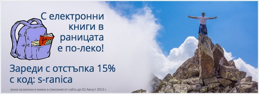 Въведете промо кода s-ranica в кошницата, когато сте добавили желаните книги и списания и отстъпката ще се калкулира.