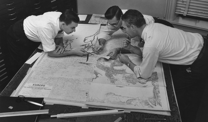 И все пак отделът, създаден от първия щатен главен редактор на списанието Гилбърт Х. Гроувнър, винаги е притежавал една уникална черта: новаторството. Първият главен картограф, Албърт Х. Бъмстед (заемал тази длъжност от 1915 до 1939 г.), положил началото: изобретил слънчев компас, използван от Ричард Е. Бърд при неговия полет до Северния полюс през 1926 г. (магнитните компаси не работят близо до полюса), както и наречената на него фотонаборна машина, която заменила трудоемкото ръчно надписване с фотографско възпроизвеждане на текста.