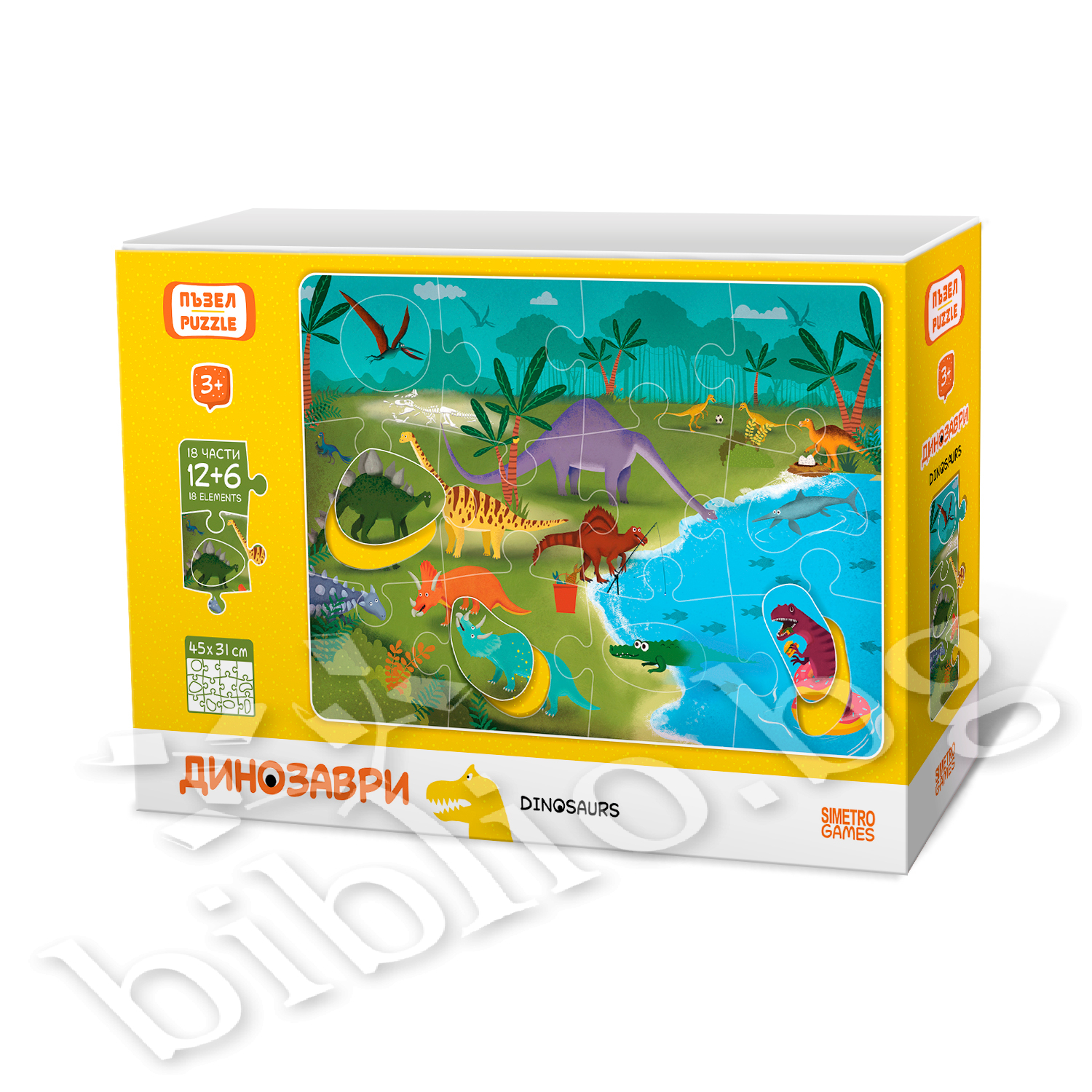 С помощта на 18-те части (12 едри парчета + 6 вложки в тях) децата ще подредят интересна картина с динозаври и ще се впуснат в собствено праисторическо приключение.