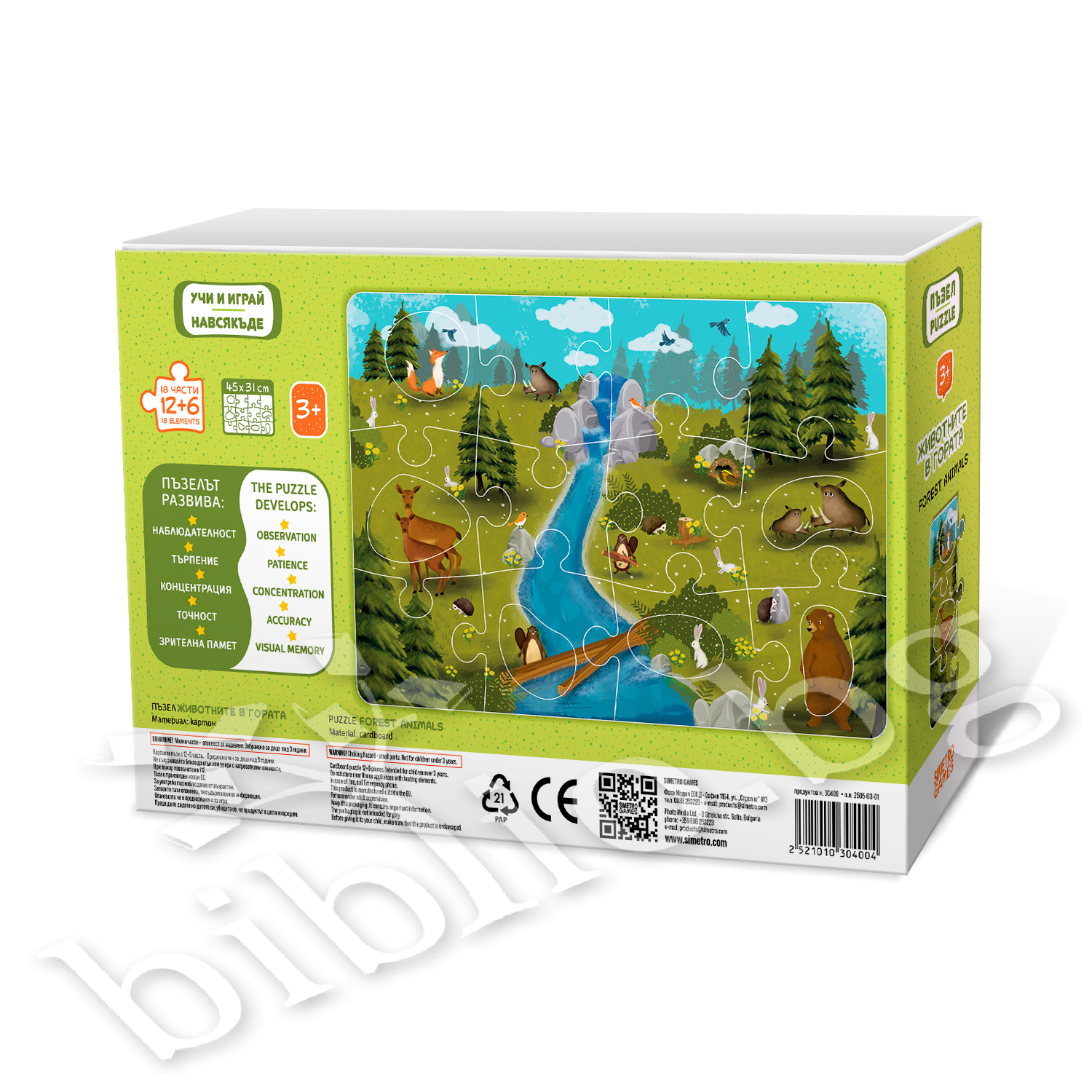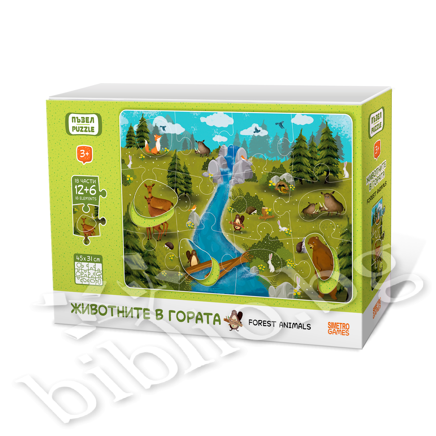 Пъзелът от 18 части (12 едри парчета + 6 вложки в тях) представя весела горска картина с любими животни, която децата ще подредят с желание и любопитство. Едновременно с това ще се учат за естествените местообитания на животните.