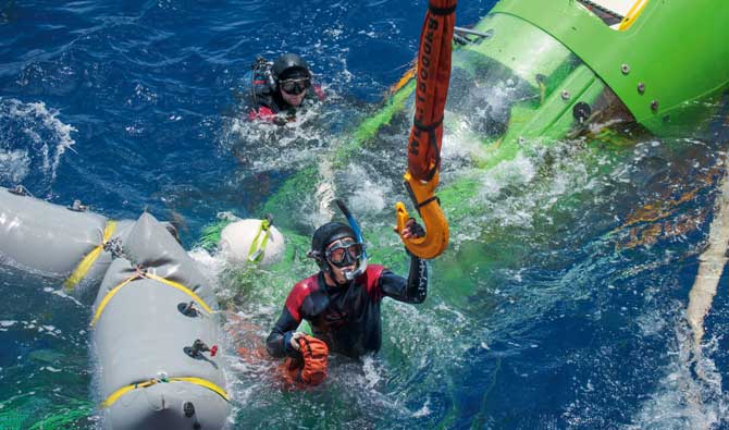 Преди съмване в черното като катран море. Моята подводница „Дийпсий Чалънджър" се люшка напред-назад, докато над мен се надигат огромните тихоокеански вълни. От полунощ сме на крак, за да започнем предстартовите тестове след няколко часа неспокоен сън. Адреналинът движи целия екип. Това са най-бурните условия, в които съм се спускал до този момент от експедицията. Чрез външните камери мога да видя двамата леководолази непосредствено до моята миниатюрна кабина, които се мятат като кукли на конци, докато се опитват да подготвят подводницата за спускането.